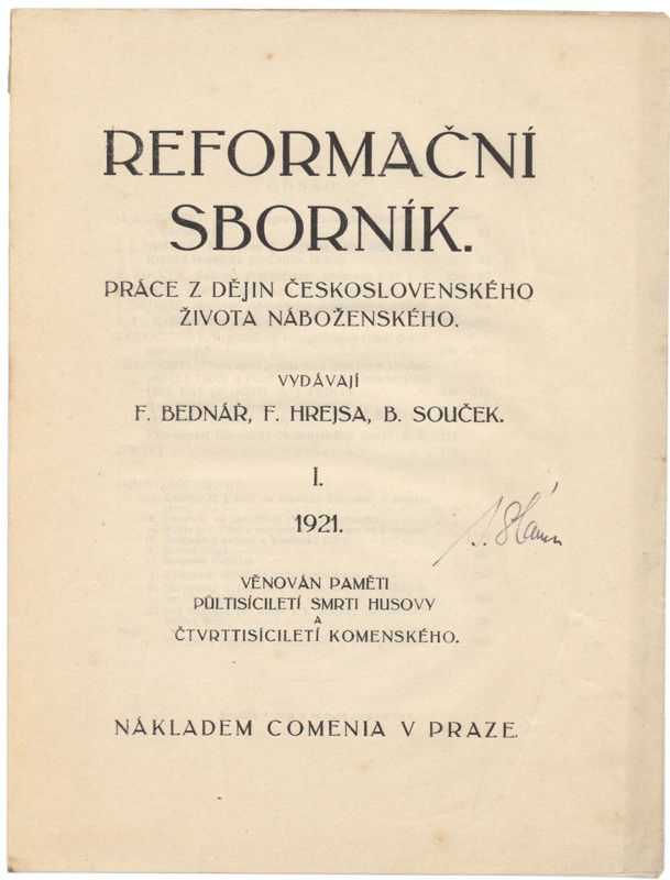 Reformační sborník : práce z dějin československého života náboženského. Sv. 1., 1921-