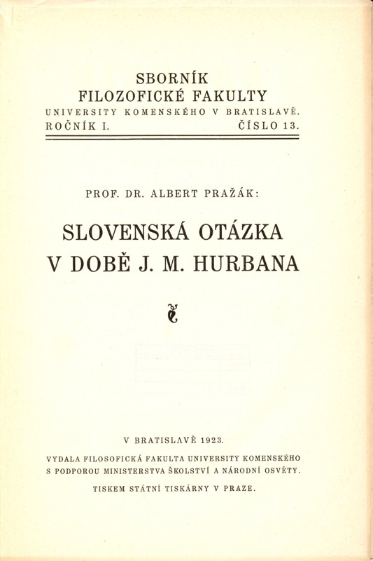 Pražák, Albert: Slovenská otázka v době J.M. Hurbana, 1923